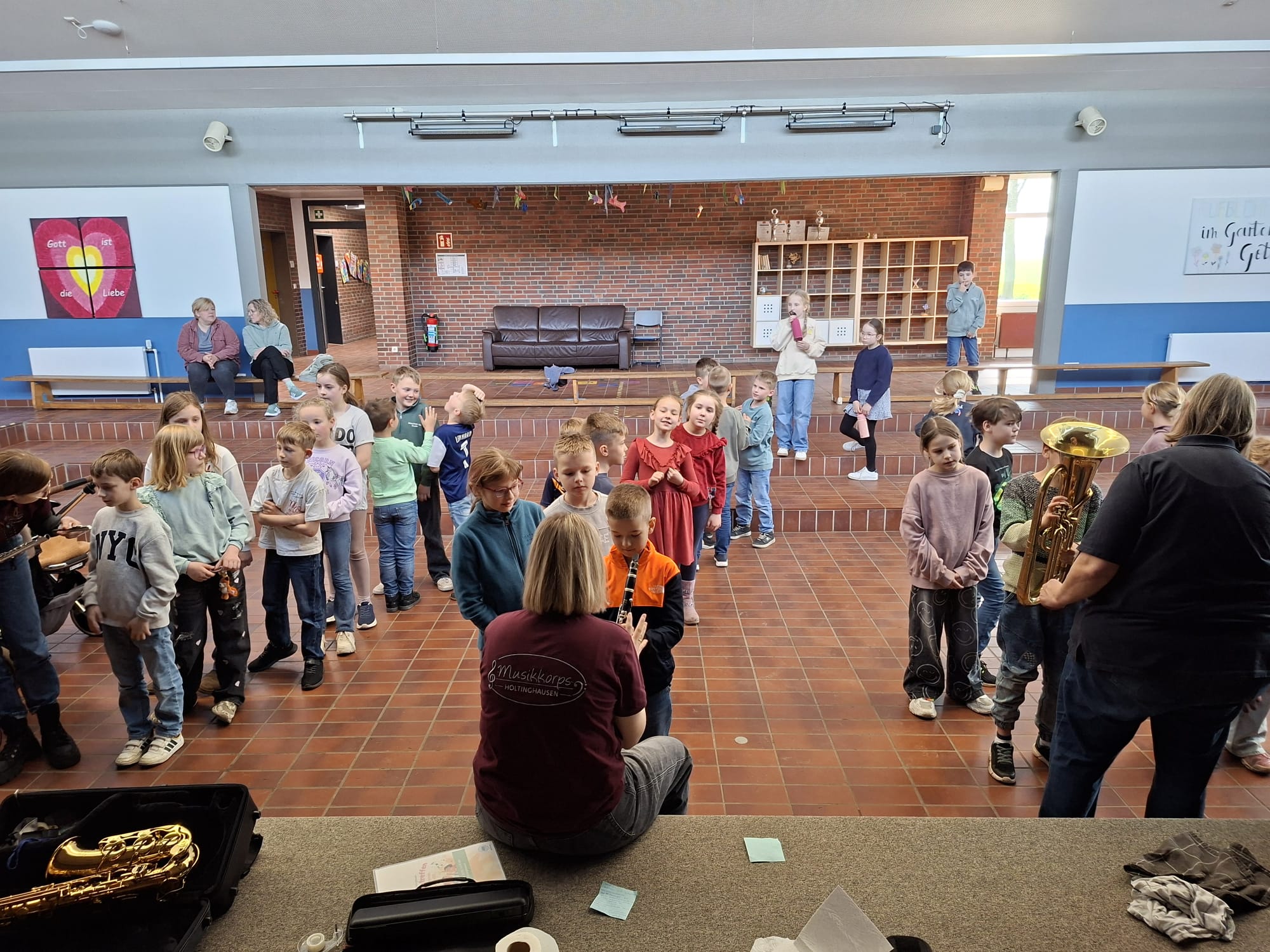 Das Jugendblasorchester Höltinghausen hat sich am 15. April bei uns in der Grundschule vorgestellt. Die Schülerinnen und Schüler des 3. und 4. Jahrgangs durften verschiedene Blasinstrumente ausprobieren. Viele Kinder zeigten dabei großes Talent und hatten viel Spaß am Musizieren.