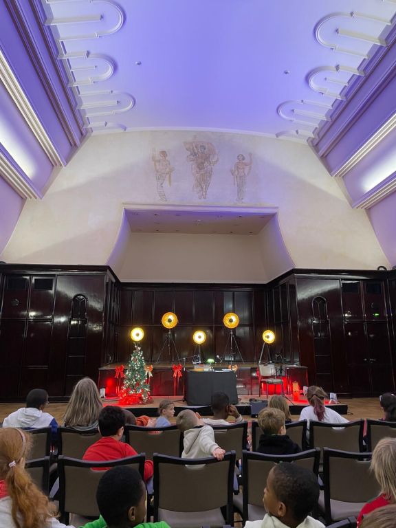 Dort wartete das nächste Highlight: eine stimmungsvolle Lesung mit musikalischer Begleitung. Die Kinder der 1a und 1b lauschten gebannt der Geschichte, während die passenden Klänge und Melodien die Figuren lebendig wirken ließen. Die Verbindung aus Erzählung und Musik verzauberte den ganzen Saal und zog die Kinder sofort in ihren Bann.