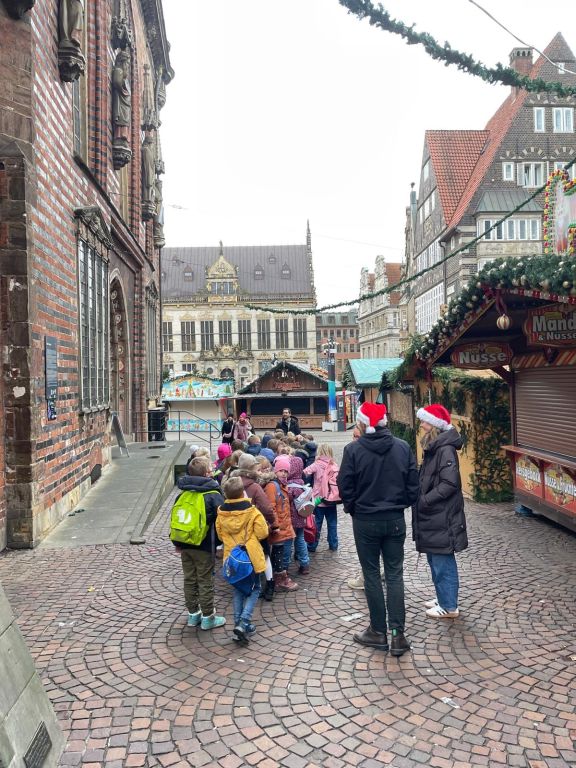 Da wir sehr früh in Bremen ankamen, besuchten wir zunächst die berühmte Statue der Bremer Stadtmusikanten. Die Kinder bestaunten Esel, Hund, Katze und Hahn und berührten den Fuß des Esels, wie es der Brauch für Glück vorsieht. Danach spazierten wir gemeinsam durch die festlich geschmückte Innenstadt zur Bremer Glocke.