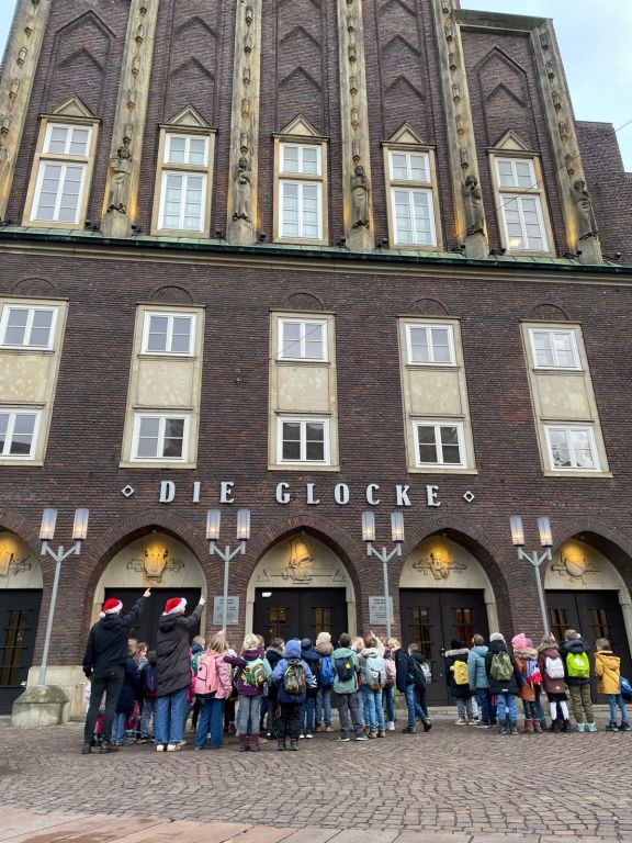 Am Montag, den 08.12.2025, machten sich die Klasse 1a und die Klasse 1b voller Vorfreude auf den Weg nach Bremen. Schon die Busfahrt war ein Erlebnis: Zwei Musikstudierende aus Oldenburg begleiteten die Kinder, stellten ihnen Instrumente vor und führten ein fröhliches musikalisches Warm-up durch. Der Bus verwandelte sich schnell in einen kleinen Konzertsaal voller Rhythmus, Lachen und gespannter Erwartung.